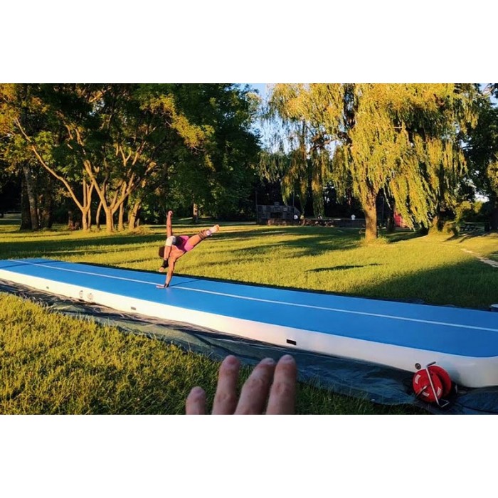 The rectangular air track mat offers enough room for most young gymnasts for individual skills such as the rounding backflip.